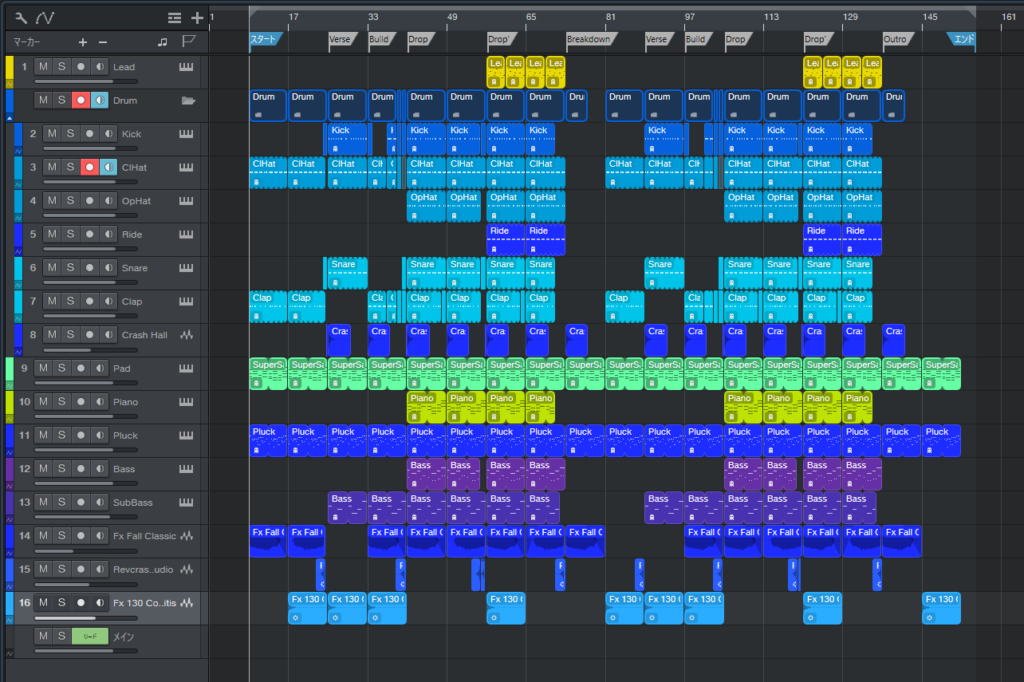 最終的なトラック数がこちら。マスタートラックを除いて16トラックです。
