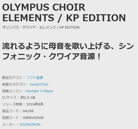 “OLYMPUS CHOIR ELEMENTS“はDTMerの間で御用達のクワイア音源です。
